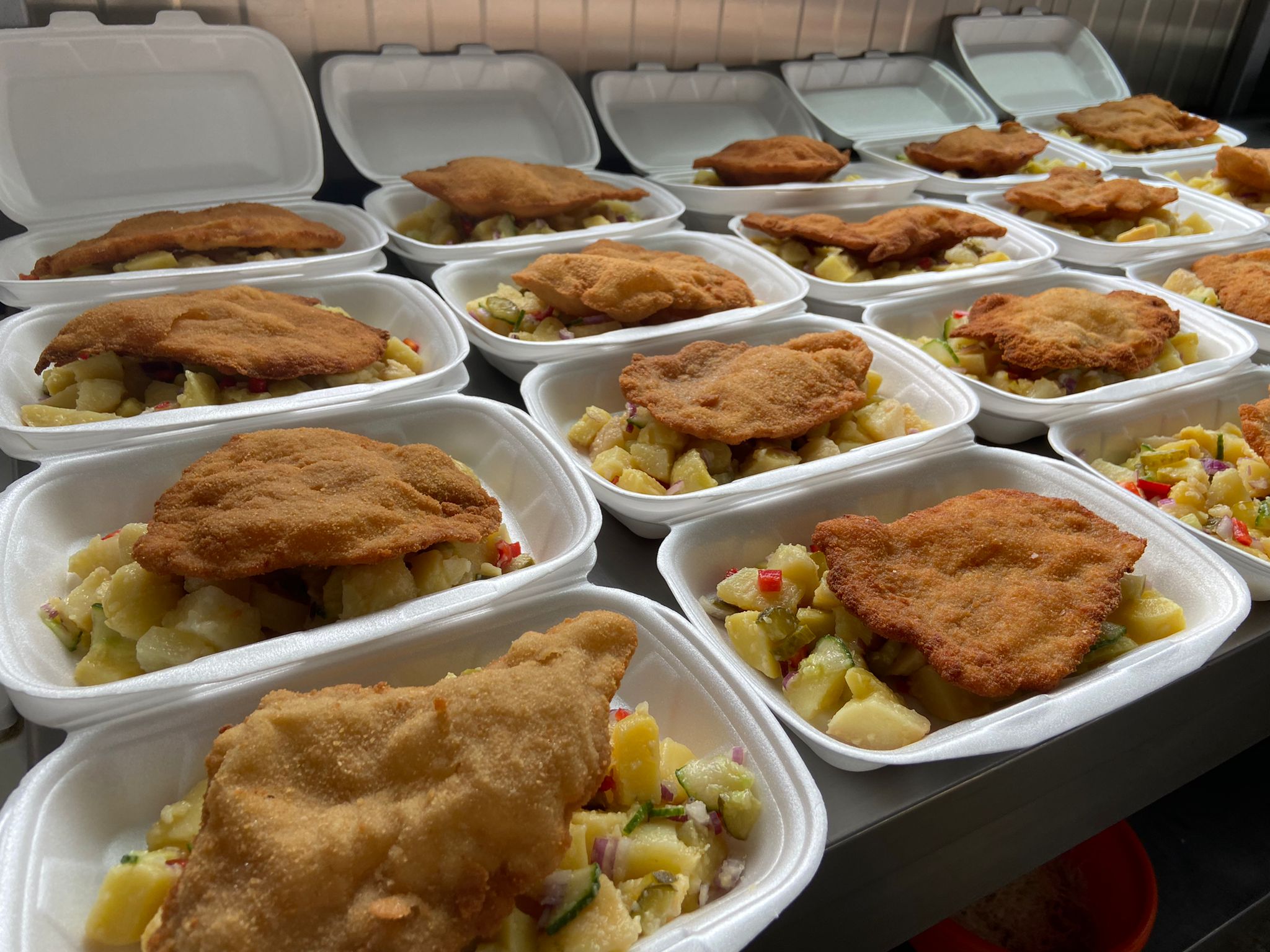 - Șnițel vienez cu orez/piure/cartofi prăjiți/cartofi aurii și salată – 40 lei
